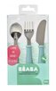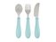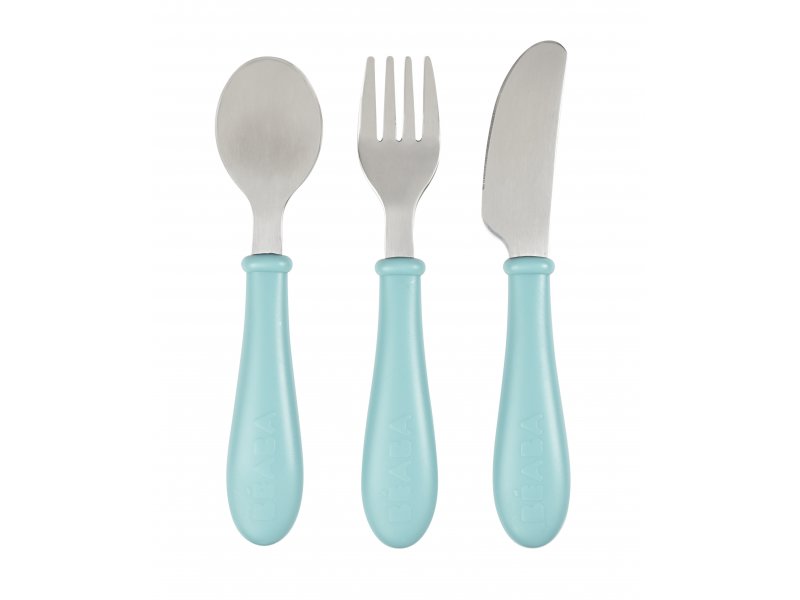 3-dílná sada příboru z kvalitní nerezové oceli s plastovou rukojetí usnadní dítěti přechod od krmení lžičkou k používání příboru. Nerezová vidlička, nůž a lžička jsou lehké a díky ergonomickému plastovému držadlu snadno uchopitelné dětskýma rukama. Prohnutý tvar držadla navíc zabraňuje kontaktu jídla se stolem při položení příboru na stůl.