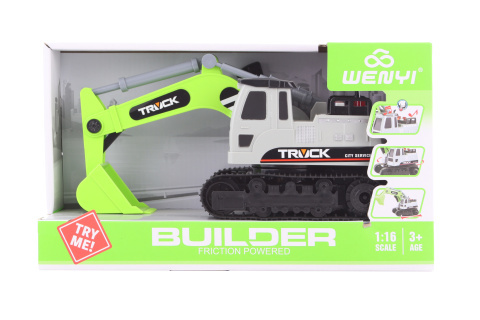 Bagr zelené barvy. Může se pohybovat dopředu i dozadu a má otáčivou kabinu. Po vložení baterií vydává zvuky. Napájení na 3 baterie AG13 (jsou součástí balení). Rozměry auta cca 26 x 12 x 13 cm. Rozměry balení cca 32 x 18,5 x 12 cm. Věk 3+ przeczytaj całość