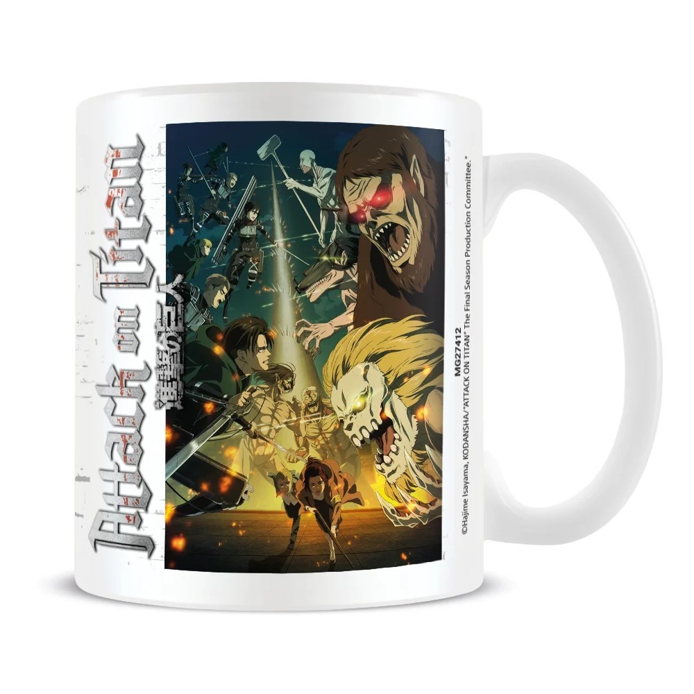Hezký keramický bílý hrnek s grafikou čtvrté řady populární japonské mangy Attack on Titan ke sledování vašich oblíbených příběhů! przeczytaj całość