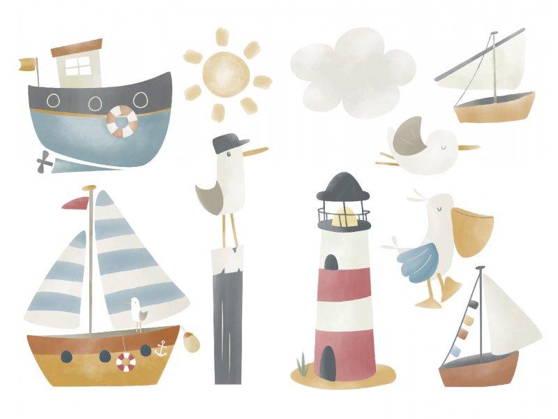 W tej kolekcji znajdziesz nie tylko naklejki, lecz także inne akcesoria, takie jak pościel, dekoracje, zabawki i artykuły do stołowania dla dzieci, dzięki czemu możesz skomponować cały pokój w marynistycznym stylu.