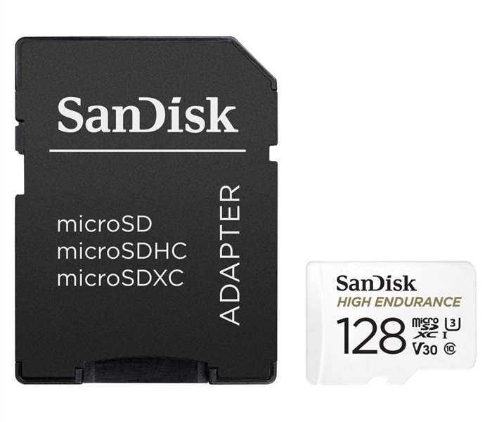 Karta pamięci w formacie micro SDXC oferuje pojemność 128 GB. Prędkość odczytu wynosi do 100 MB/s, a prędkość zapisu do 40 MB/s. W zestawie znajduje się adapter SD.