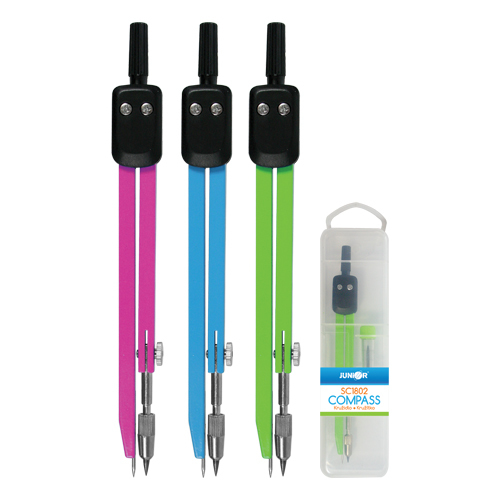Szkolny metalowy cyrkiel prosty, z czarnym plastikowym uchwytem. W zestawie znajduje się zapasowy grafit. Cały zestaw jest zapakowany w praktyczne plastikowe pudełko. Cyrkiel dostępny jest w trzech pastelowych kolorach - niebieskim, zielonym, różowym. Prosimy o podanie wyboru koloru w uwagach przeczytaj całość