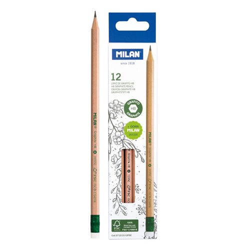 Grafitové ceruzky HB s gumou 12 ks. Olovo s priemerom 2,2 mm. Šesťhranný tvar. Nachádzajú sa v strede stupnice tvrdosti HB grafitu, ktorá sa odporúča na písanie a kreslenie. Elektróda ponúka rovnomerný zdvih a je odolná proti zlomeniu vďaka systému na ochranu olova (LPS), ktorý chráni tuhu vďaka jej priľnavosti k drevu. Drevo pochádza z lesov s dôrazom na udržateľnosť. Veľkosť ceruzky: 188 x 7 mm.