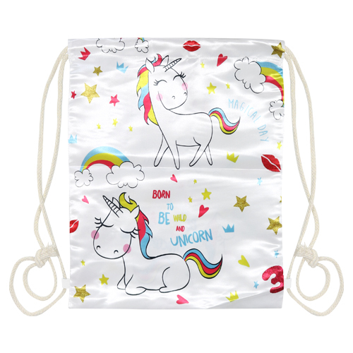 Textilné vrecko na prezuvky s lesklou potlačou “Born To Be Unicorn“ so zarážkami na oboch stranách. Vak je vhodný pre športové využitie aj bežné nosenie. przeczytaj całość