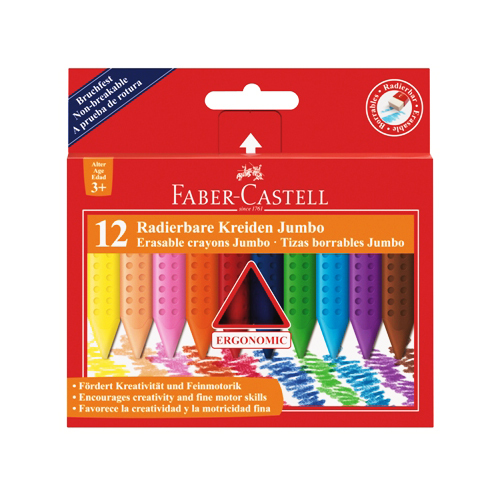 Trójkątne kredki z ergonomicznym miejscem chwytu w designie GRIP. Są gumowalne i nie brudzą rąk. Nadają się dla praworęcznych i leworęcznych. Wspierają kreatywność i małą motorykę (uchwyt trzypunktowy). Odporne na łamanie. Ostrzeżenie!: Nieodpowiednie dla dzieci poniżej trzech lat - zawiera małe części, które mogą zostać połknięte. Istnieje ryzyko zadławienia.
