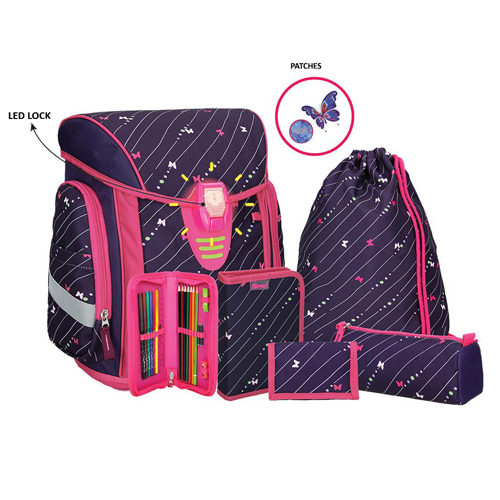 Set obsahuje: školskú tašku, vrecko na prezúvky, 19-dielny peračník, puzdro na pera, peňaženku a 2 stickery.• vysokokvalitná patentovaná spona s LED osvetlením a kvalitné prevedenie materiálu• vyvinutý LED zámok s tromi rôznymi stupňami blikania• reflexné pásy, ktoré zvyšujú viditeľnosť a...