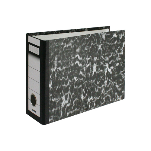Segregator całopapierowy z zewnętrzną marmurową powłoką, z nadrukowaną etykietą na grzbiecie. Oczko grzbietowe ma metalowe obszycie. Segregator nie ma listew ochronnych ani zamka. Papier i tektura wykonane w 100% z włókien z recyklingu. Po użyciu produkt jest w 100% nadający się do recyklingu. przeczytaj całość