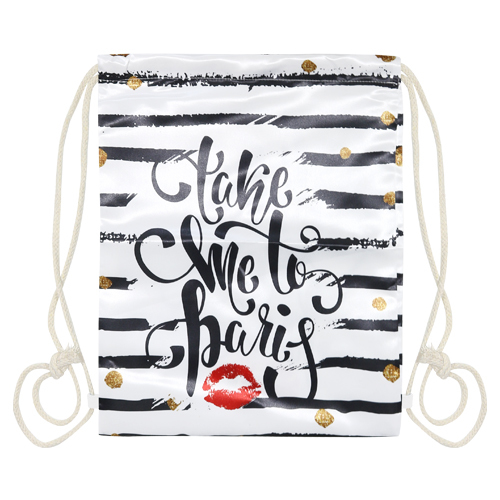 Textilné vrecko na prezuvky s lesklou potlačou “Take Me To Paris“ so zarážkami na oboch stranách. Vak je vhodný pre športové využitie aj bežné nosenie. przeczytaj całość
