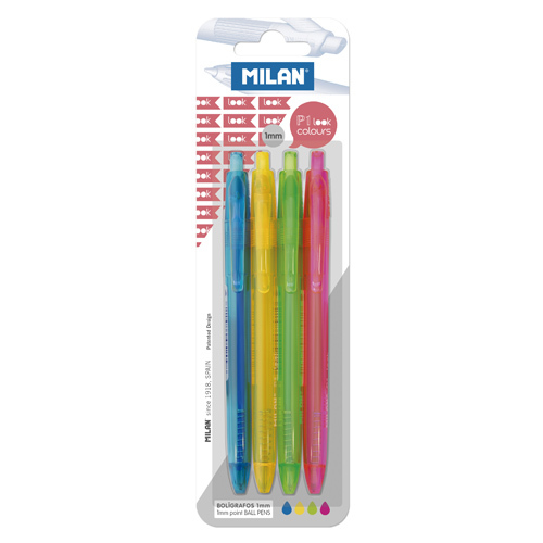 Sada 4 kuličkových per MILAN P1 Look 1,0mm, s průsvitným plastovým tělem. Sada obsahuje 4 pera trendových barev: modrá; žlutá; zelená; růžová. Pero píše v barvě těla. przeczytaj całość
