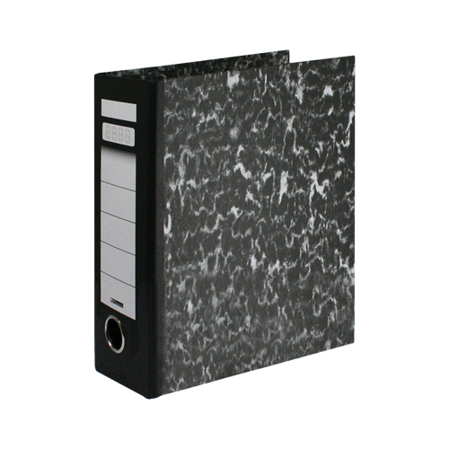 Pořadač celopapírový s vnějším mramorovým potahem, s natištěným zádovým štítkem. Hřbetní kroužek má kovové lemování. Pořadač nemá ochranné lišty a radozámek. Papír a lepenka vyrobená ze 100% recyklovaných vláken. Po použití je výrobek 100% recyklovatelný. przeczytaj całość