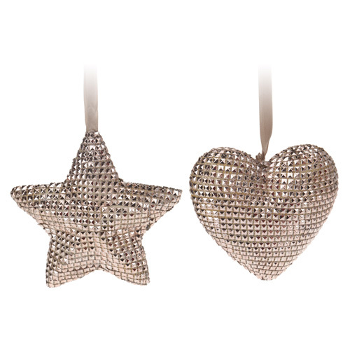 Vánoční dekorace závěsná. V zlatém provedení s vysokým leskem, zavěšené na stužce. Nerozbitná ozdoba s nádechem luxusu díky atraktivní aplikaci. V nabídce tvar hvězdy nebo srdce. przeczytaj całość