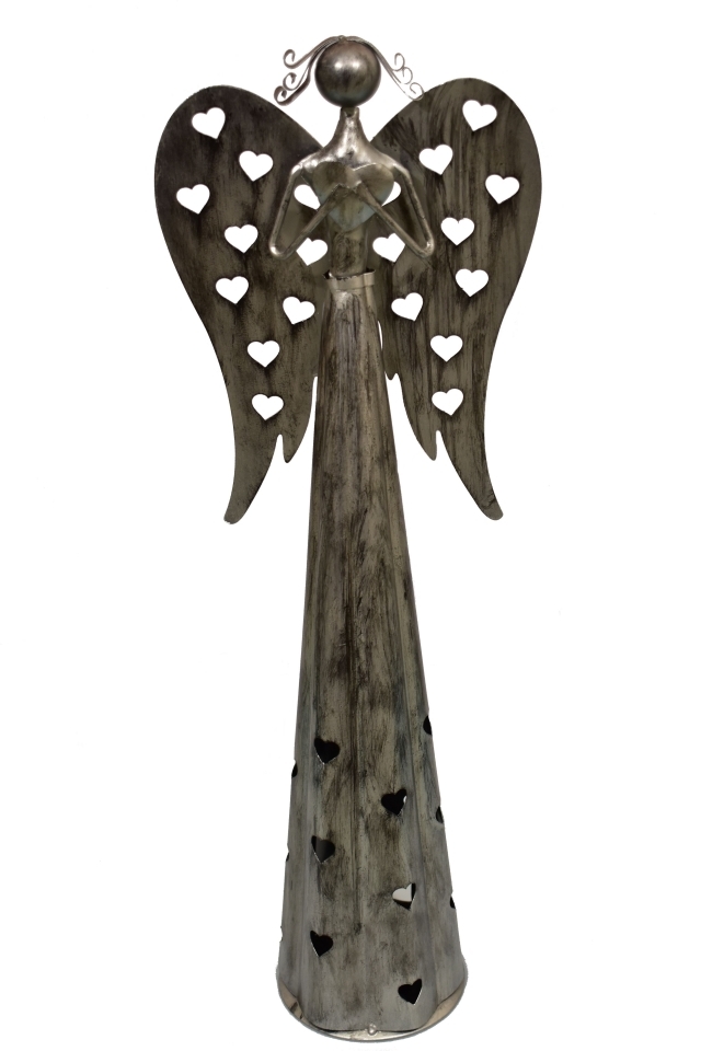 Plechový srdíčkový anděl na čajovou svíčku 38 cm