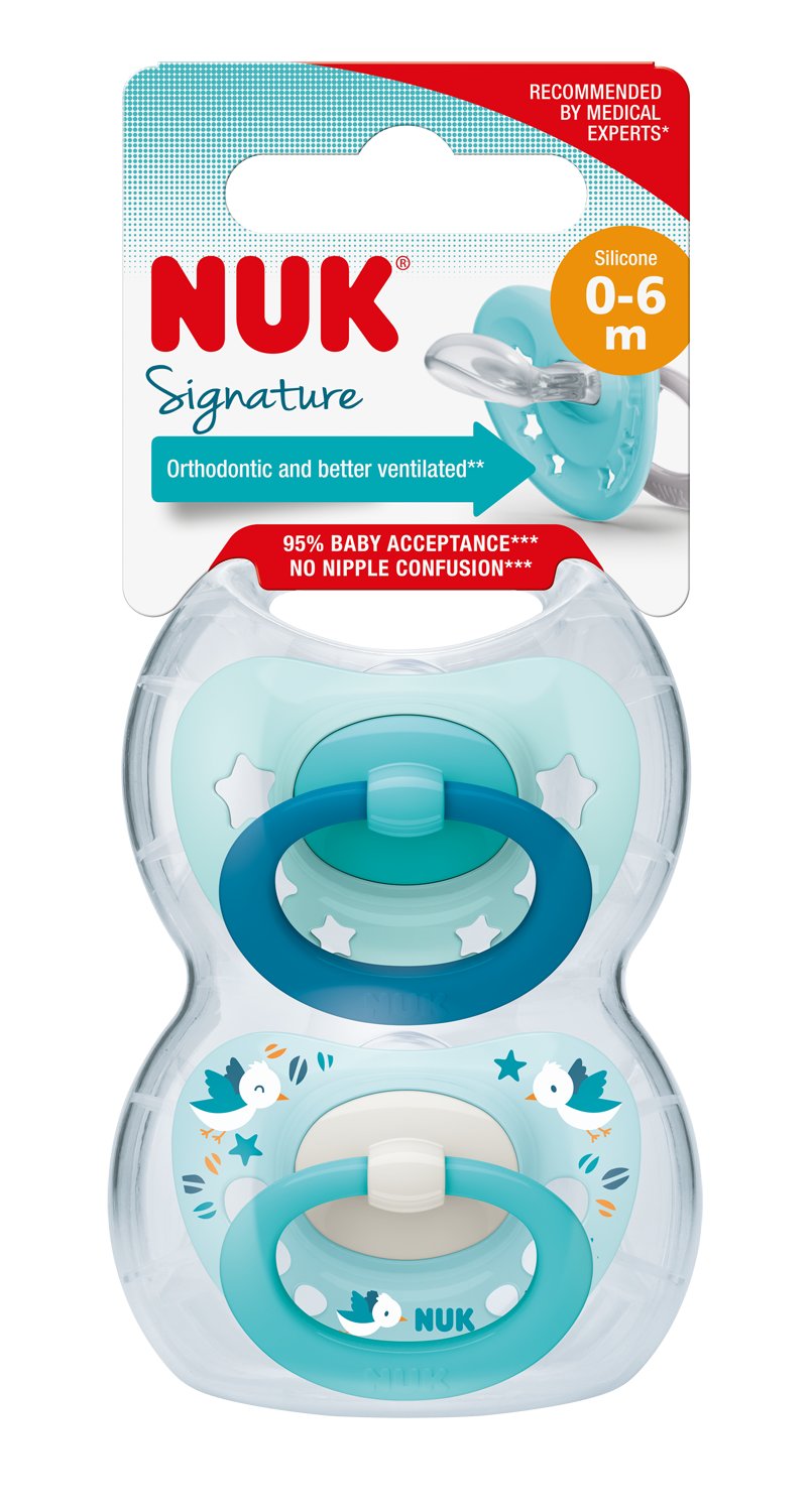 Smoczek NUK Signature doskonale dopasowuje się do ust dziecka. Smoczek jest na tyle płaski, cienki i wąski, że naturalnie mieści się w buzi maluszka. Dzięki swojej kompaktowej konstrukcji pozostawia językowi dostatecznie dużo miejsca na naturalne ruchy ssania. Smoczek wiernie naśladuje brodawkę podczas karmienia piersią i potrafi uspokoić dziecko jeszcze lepiej niż dotąd. Swój ortodontyczny kształt nie utrudnia prawidłowego rozwoju zębów i dziąseł, co potwierdza 100% stomatologów. Zewnętrzna część posiada otwory wentylacyjne, które chronią przed zaparzeniem skóry. Przezroczysty miękki silikon o gładkiej powierzchni jest łatwy do czyszczenia i gotowania. Materiał jest neutralny smakowo i wolny od BPA. Zrównoważony rozwój jest dla nas najwyższym priorytetem. Chcemy dać rodzicom możliwość wielokrotnego używania naszego opakowania po otwarciu produktu, bez konieczności wyrzucania go. Każdy smoczek NUK dostarczamy w wytrzymałym, wielokrotnego użytku pudełku. Utrzymuje ono smoczek w czystości i bezpieczeństwie, zwłaszcza gdy jesteście w podróży. Pudełko nadaje się ponadto do sterylizacji w kuchence mikrofalowej.