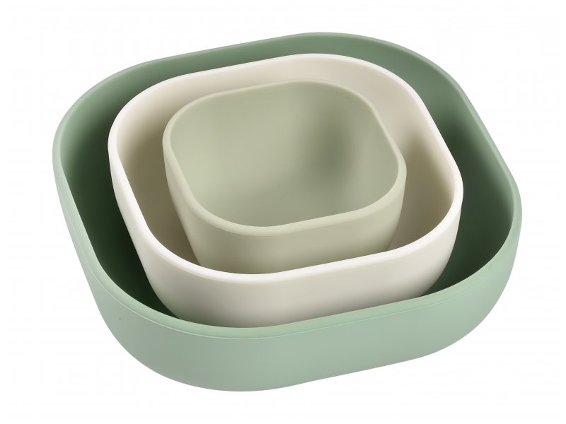 Zestaw trzech misek z wysokiej jakości silikonu w trzech rozmiarach można stosować od pierwszych pokarmów dla niemowląt aż po podawanie obiadu czy przekąski dziecku w wieku niemowlęcym i wczesnym okresie rozwoju. Wysokie ścianki i zaokrąglony kształt ułatwiają nabieranie pokarmu. Miski łatwo się przechowuje, wkładając je jedna w drugą.