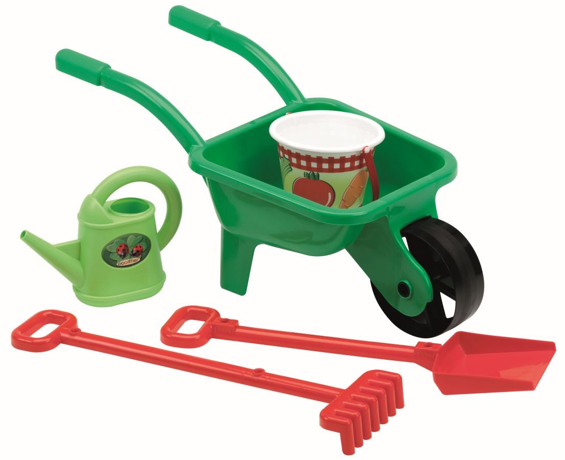 Zahradní kolečko zelené s konvičkou, lopatou, hráběmi a kyblíčkem s obrázky zeleniny. Rozměry kolečka: 66 x 28 x 28 cm. Délka lopata/hrábě 51 cm. przeczytaj całość