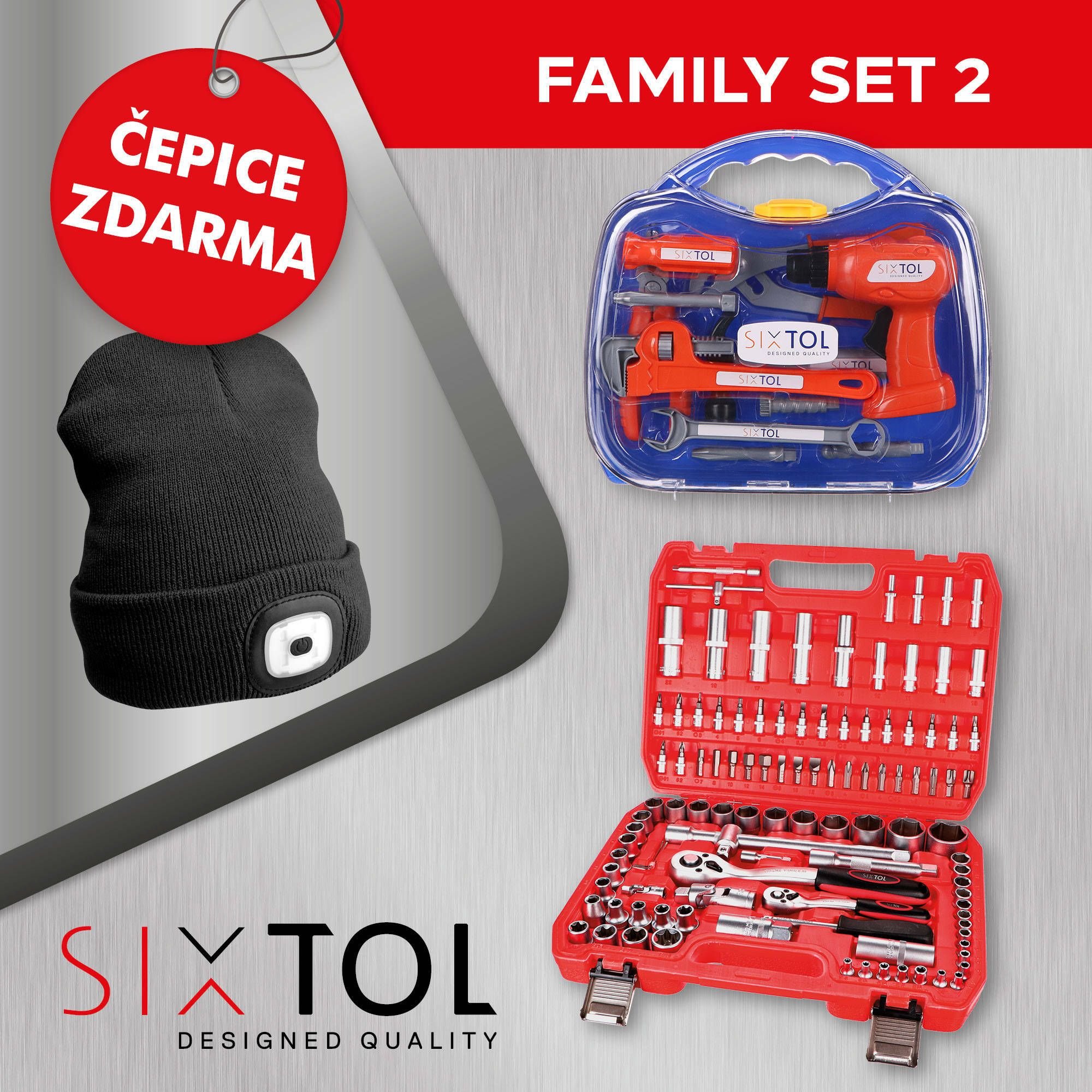 SET 2 Gola sada CRV 108 profi + Dětské nářadí KIDS 12 + Čepice s čelovkou B-HAT, černá SIXTOL