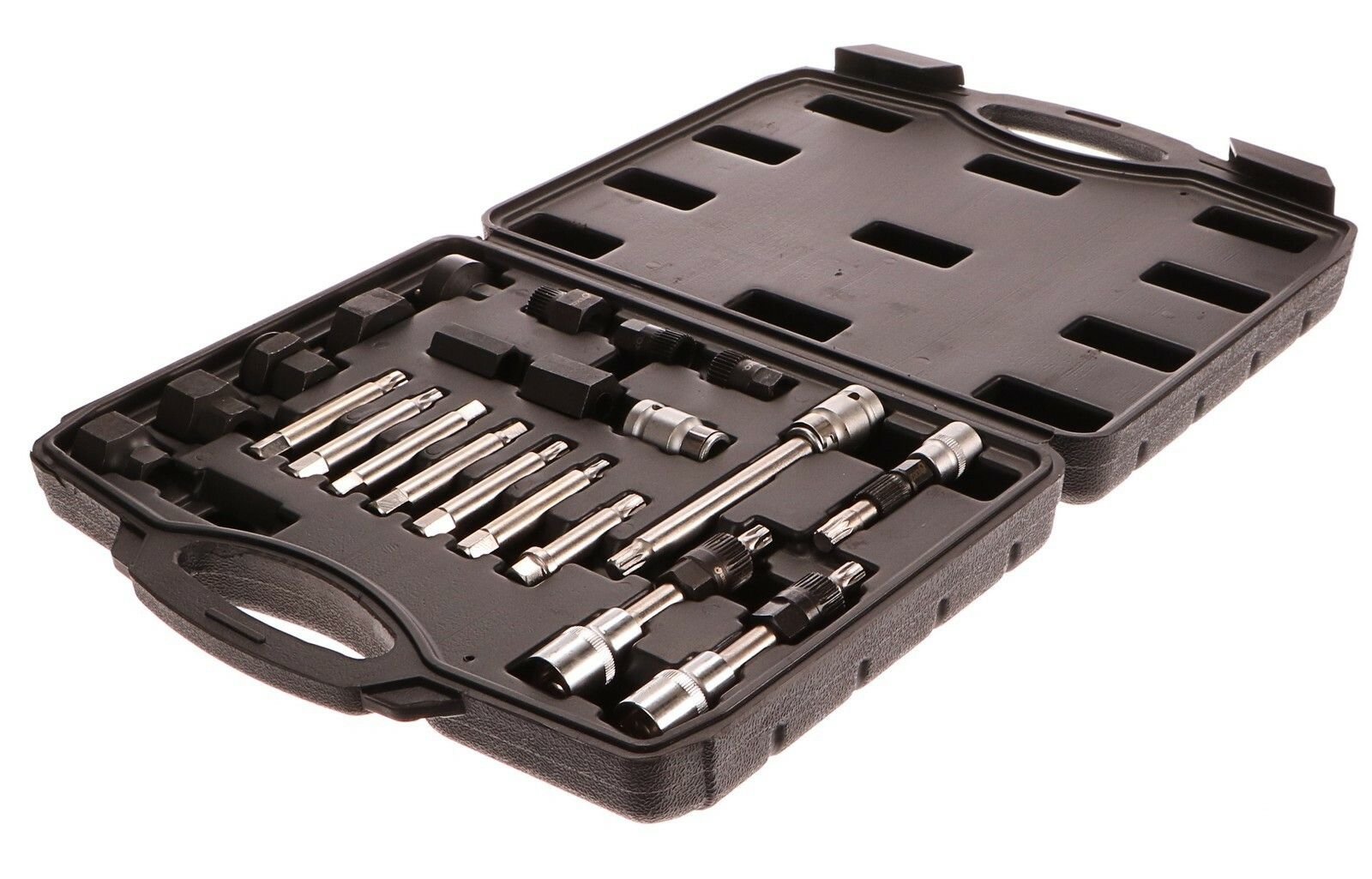 Sada bitů hex a hvězdy pro alternátor, 22 ks, 1/2”Sada klíčů pro montáž a demontáž alternátorů. Klíče jsou vyrobeny z vysoce kvalitní chrom-vanadové oceli CrV, díky čemuž jsou odolné a odolné vůči poškození. Klíč umožňuje současné odšroubování upevňovacího šroubu řemenice (pomocí příslušného...