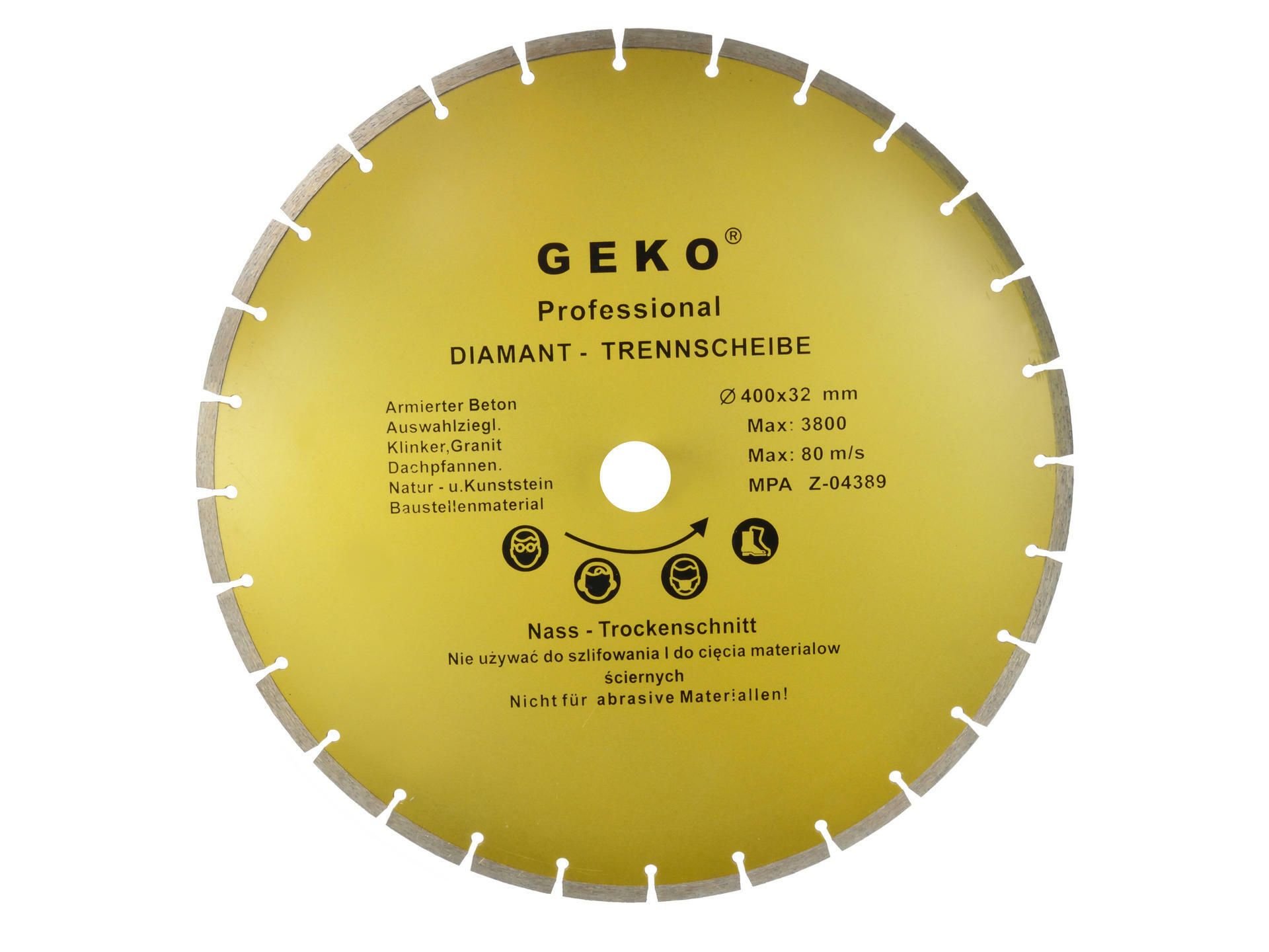 Kotouč diamantový řezný segmentový, 400x8x32mm GEKOPrecizní diamantový řezný kotouč GEKO s přerušovaným diamantovým segmentem po celém obvodu (s drážkami, výřezy), který je rozdělený na určitý počet užších segmentů. Tyto výřezy kotouč během řezání chladí a vynáší obroušený materiál z řezu ven....