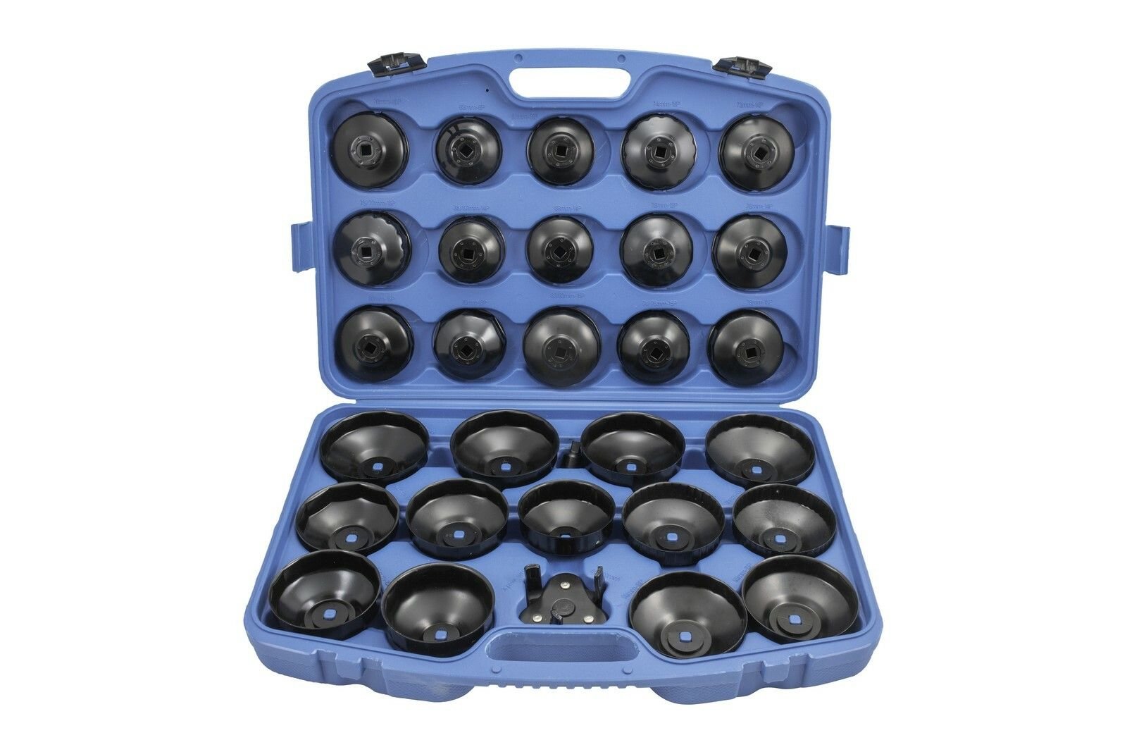 - Sada obsahuje 28 různých klíčů na většinu běžných automobilůRozměry: 65mm 14-hran; 66mm 6-hran; 65-67mm 14-hran; 68mm 14-hran; 73mm 14-hran; 74mm 15-hran; 74-76mm 15-hran; 75-77mm 15-hran; 76mm 12-hran; 76mm 8-hran; 76mm 14-hran; 76mm 30-hran; 78mm 15-hran; 80mm 15-hran; 80-82 15-hran; 86mm 16-hran; 86mm 18-hran; 90mm 15-hran; 92mm 10-hran; 93mm 15-hran; 93mm 36-hran; 93mm 45-hran; 95mm 15-hran;96mm 18-hran; 100mm 15-ti hran; 106mm 15-ti hran; 108 15-ti hran; 108mm 18-ti hranTřípackový samostavitelný klíč 65 - 120mmPřechod z 1/2" na 3/8"Sada miskovitých klíčů na olejové filtry v plastovém kufříku obsahuje 30 kusů nejrozšířenějších rozměrů těchto klíčů. Všechny mají speciální povrchovou úpravu. Používají se v kombinaci s klíčem/ráčnou se čtyřhranem 3/8" nebo 1/2", protože součástí sady je i adaptér 1/2" na 3/8" .Následující přehled přibližuje rozměry jednotlivých klíčů a jen velmi orientačně uvádí i jejich použití pro určité značky a modely automobilů. Samozřejmě není možné vycházet vždy pouze z nějaké značky a modelu vozu, neboť ke konkrétnímu motoru lze navíc používat alternativně několik olejových filtrů. Značnou roli tedy hraje i značka a typ filtru. Také označení klíčů z hlediska počtu "hran" není úplně přesné. Některé klíče mají fakticky určitý počet hran, u jiných jde spíš o specifické výstupky apod.
