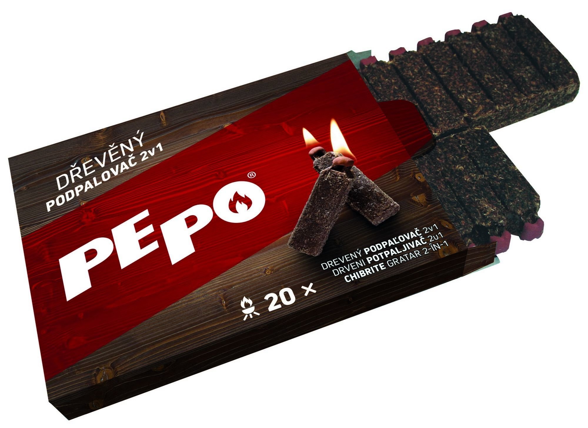 PE-PO drewniana rozpałka 2w1, w formie odłamujących się elementów, zawiera sprasowane trociny nasączone parafiną i na końcu jest wyposażona w zapałkę. Zapałka jest częścią pudełka. Interesująca alternatywa dla klasycznych stałych lub płynnych rozpałek.