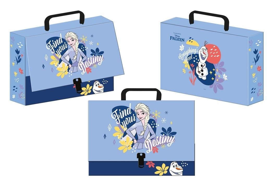 Teczka walizeczka - kartonowa/sztywna teczka z rączką, zapinana plastikowym mechanizmem z przodu. Doskonała dla przechowywania i przenoszenia zeszytów, brulionów, dokumentów, zdjęć, bloków rysunkowych, kredek i wielu innych. Kolorowa na zewnątrz, pokryta połyskową folią, wewnątrz zadruk w jednym kolorze dopasowany kolorystycznie do zewnętrznej części teczki. Motyw z serii Kraina Lodu.