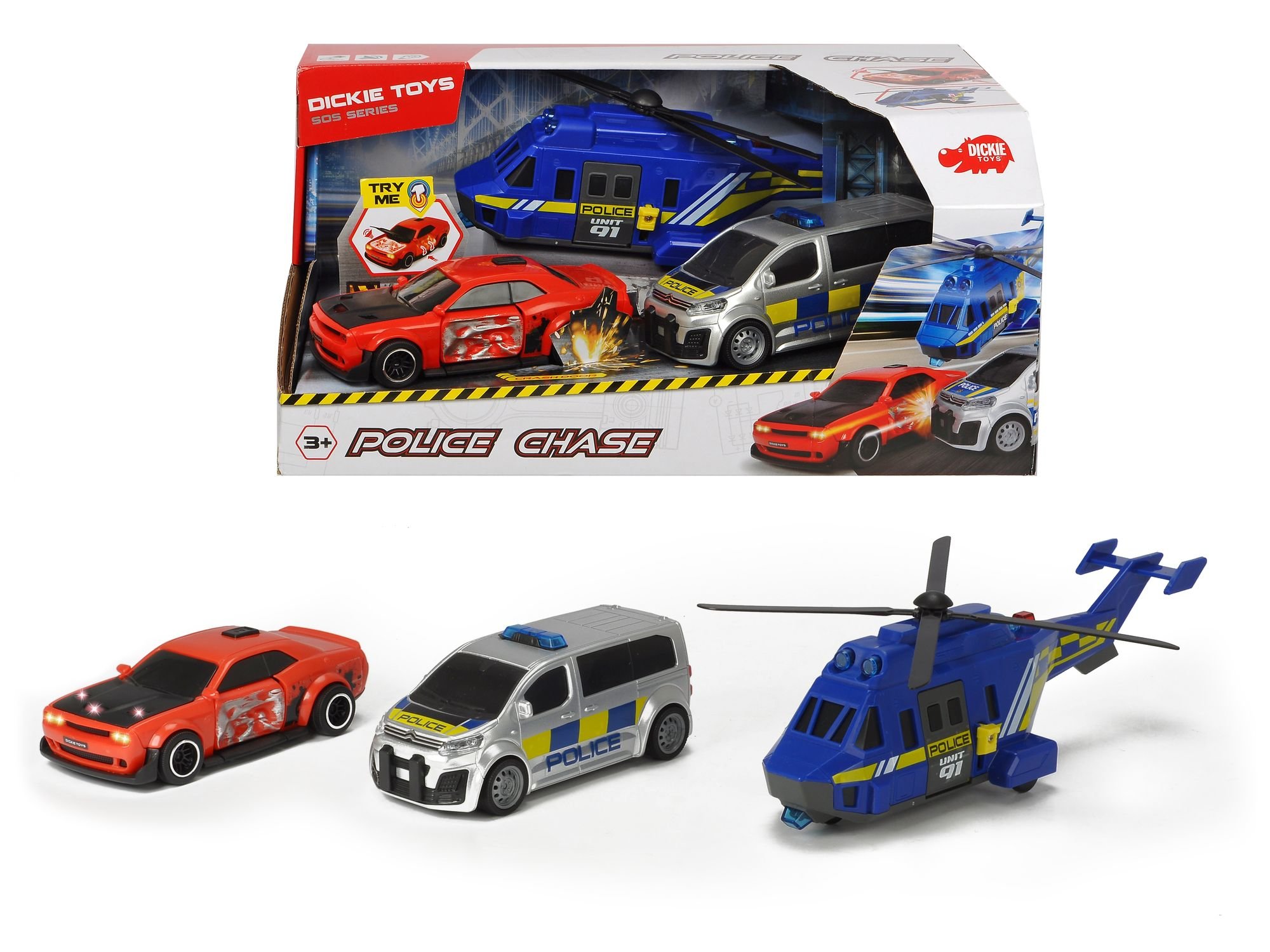 Policejní honička - helikoptéra se zvukovými a světelnými efekty, policejní dodávka Citroen na volnoběh, auto Dodge Hellcat se světelnými a zvukovými efekty a speciální bouracím efektem. przeczytaj całość