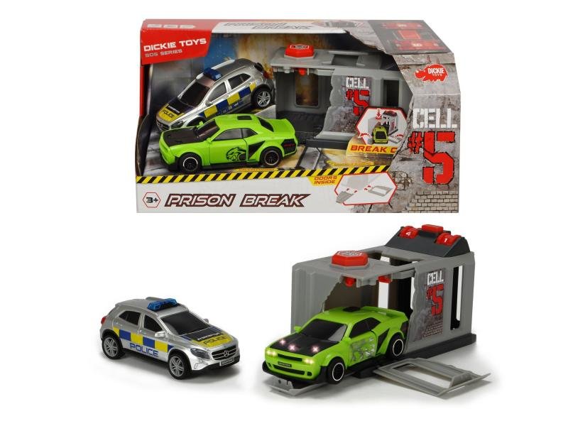 Vězeňská cela se zakódovaným zámkem a tlačítkem pro únik, policejní auto Mercedes na volnoběh a auto Dodge Hellcat Villain se světelnými a zvukovými efekty a speciálním bouracím efektem. przeczytaj całość