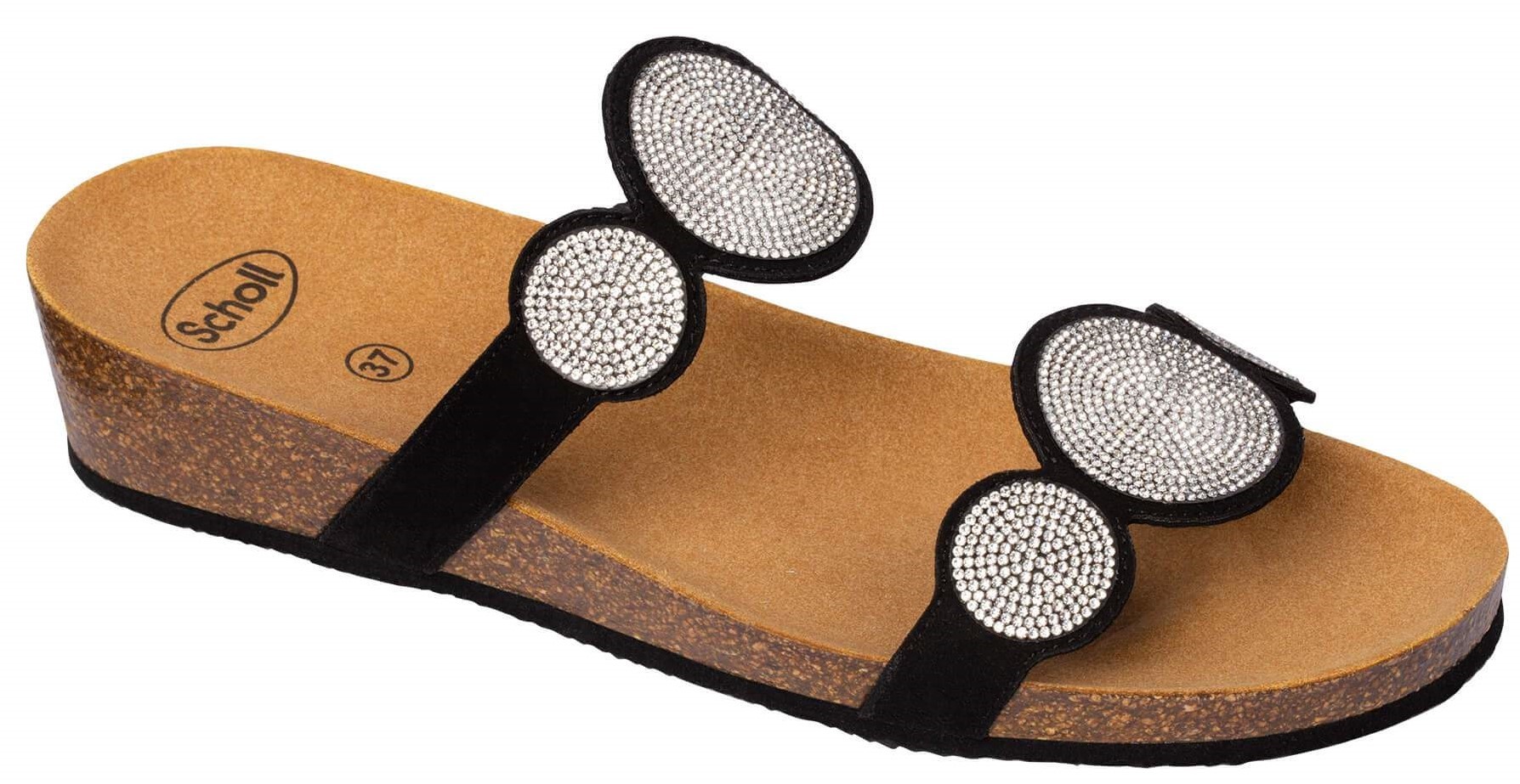 Model Sharon Flip Flopje novinka od firmy Scholl. Jedná se o pantofle na klínku ozdobené zirkony s korkovým klínkem a semišovou stélkou. Barva černá Detaily produktu Výška podpatku:40 mm Černá barva Vyjímatelná vložka: ne Materiál podšívky: syntetika Materiál stélky: mikrovlákno... przeczytaj całość