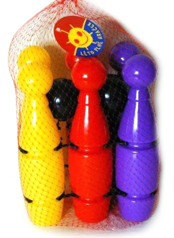 Plastové kuželky různých barev se dvěma koulemi a nosičem. przeczytaj całość
