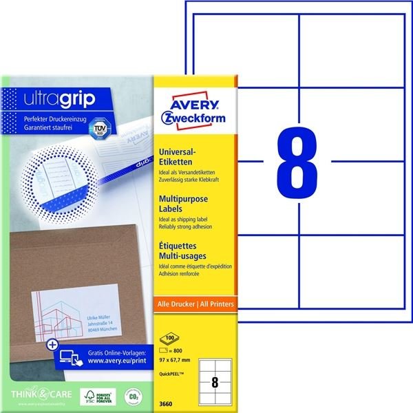Inovativní technologie ultragrip na zadní straně archu zajišťuje bezchybné natažení archu etiket a tisk bez zasekávání archu etiket v tiskárně Univerzální bílé etikety jsou určeny pro každodenní použití na listovní zásilky a balíky, na označování, číslování, oceňování sortimentu či výrobků...