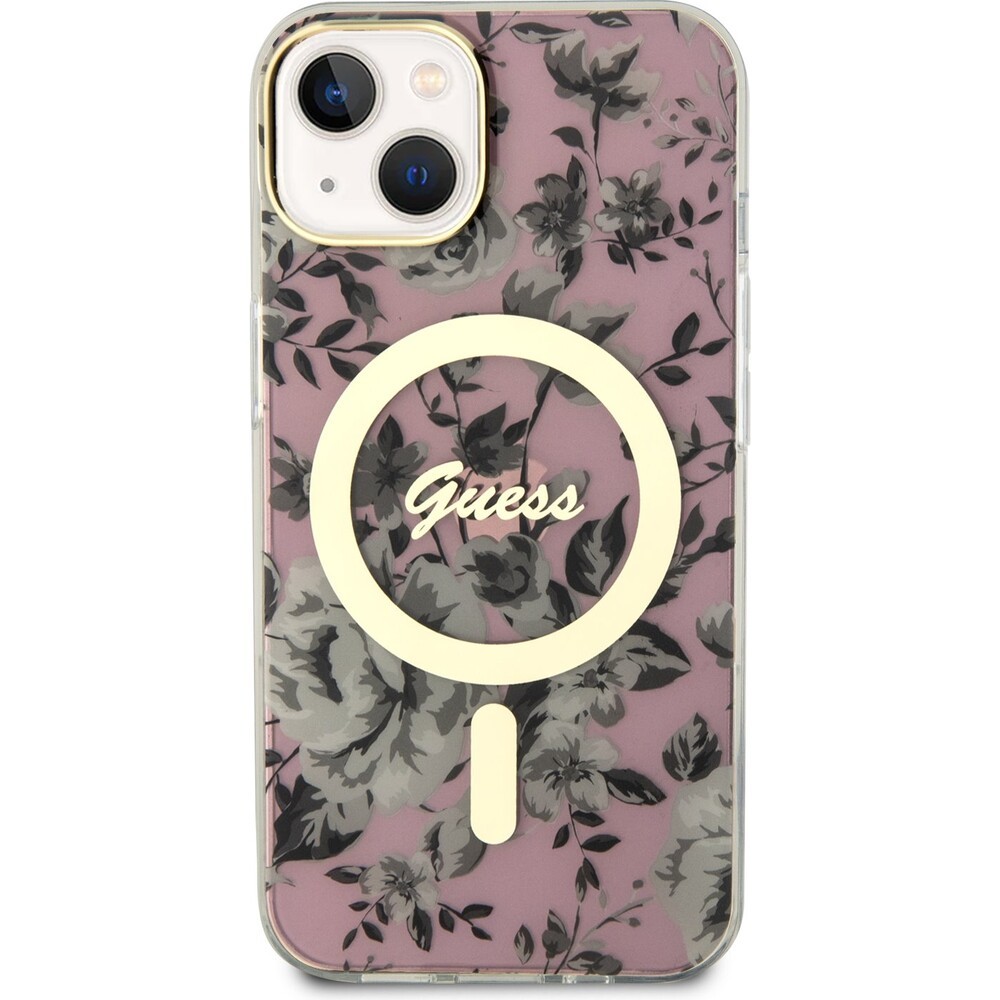 Guess PC/TPU Flowers IML MagSafe kryt iPhone 14 růžový