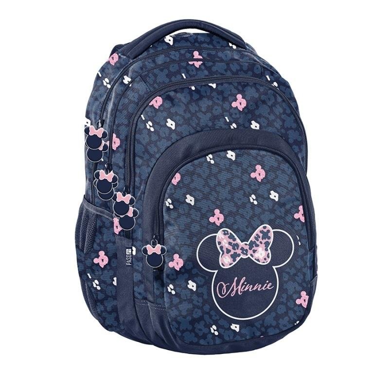 Plecak szkolny. Trzy pojemne komory, kieszeń przednia z organizerem, 2 boczne kieszenie z siatki + materiał. Wzmocnione profilowane plecy, miękkie wygodne szelki. Wzmocniony i usztywniony spód. Wygodny uchwyt do przenoszenia i uszko do powieszenia. W komorze głównej przegroda (na laptop), w drugiej komorze organizer z kieszenią na zamek, uchwyt na klucze. Elementy odblaskowe dla większego bezpieczeństwa.