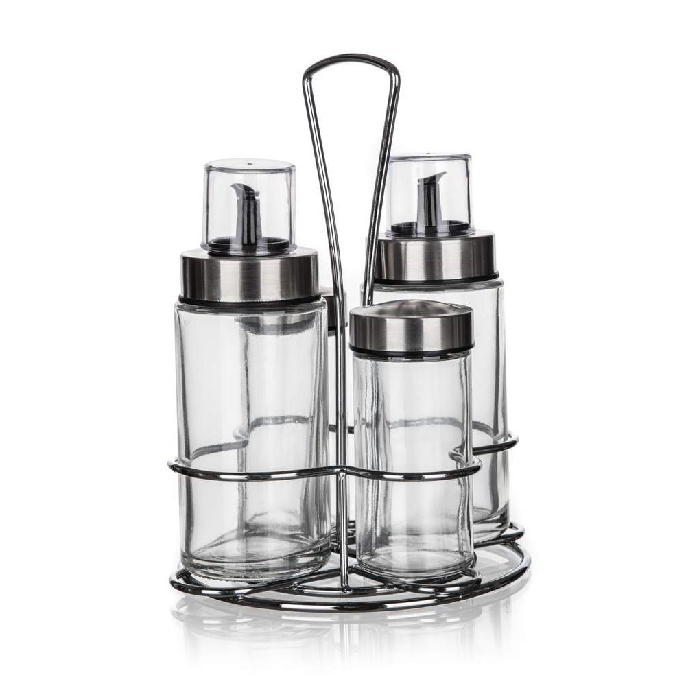 Zestaw do doprawiania AKCENT 5 szt. jest idealnym pomocnikiem w twojej kuchni do doprawiania sałatek i innych potraw według twojego smaku. Skład zestawu: pojemnik na olej 170 ml, pojemnik na ocet 170 ml, solniczka 90 ml, pieprzniczka 90 ml i stojak. przeczytaj całość