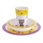 Ten trzyczęściowy zestaw zawiera wszystko, czego Twoje dziecko potrzebuje do wygodnego jedzenia - kubek, głęboką miskę i płytki talerzyk. Materiał PP (plastik) jest odporny na typowe temperatury od -20 °C do +95 °C, co pozwala na używanie go w kuchence mikrofalowej oraz mycie w zmywarce do 60 cykli bez uszkodzenia nadruku lub pogorszenia jakości materiału. Wymiary poszczególnych elementów są dopasowane do dziecięcych rączek i porcji, dzięki czemu użytkowanie jest wygodne i bezpieczne.