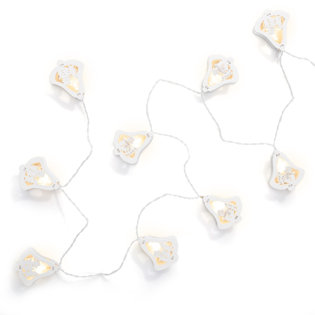 Světelný řetěz v originálních tvaru dřevěných zvonečků je dlouhý 185 cm. Má 10 LED s roztečí 15 cm, které vyzařují jasné a teplé světlo. Dřevěné zvonečky jsou v rozměru 6 cm x 5,5 cm. Zdroj je na tužkové baterky 3x AA 1,5V. przeczytaj całość