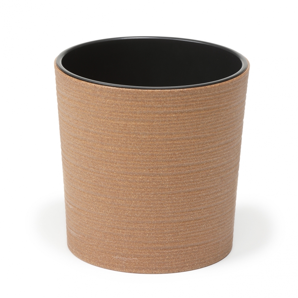 Niska plastikowa doniczka żłobkowana o matowej powierzchni, lekko stożkowego kształtu, z wyjmowaną czarną plastikową wkładką. Rośliny można sadzić bezpośrednio do plastikowej wkładki, jeśli nawiercisz w jej dnie otwory odpływowe. Nowa seria doniczek ECO jest wykonana z recyklowanego plastiku z istotnym dodatkiem drewna. Każda doniczka z serii ECO zawiera do 40% drewna. Kolor: naturalne drewno Wymiary: wysokość 19,5 cm średnica u góry 19 cm