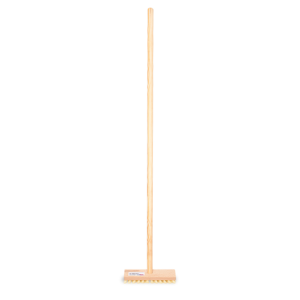 Dřevěný kartáč na podlahu s holí. Délka čistící plochy 23 cm, šířka 8 cm, výška štětin 3 cm. Dřevěná hůl 130 cm. przeczytaj całość