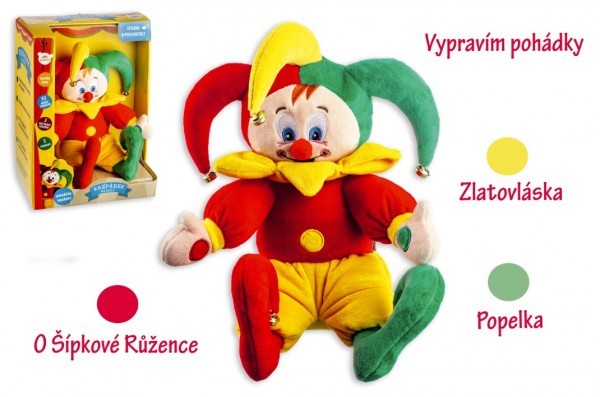 Kašpárek mluvící pohádky plyš 30 cm na baterie v krabici 26x36x15cm