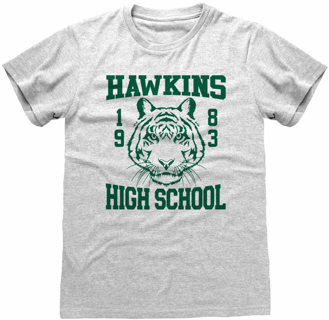 Oficiální pánské tričko z katalogu fashion a dárkových produktů s grafikou, logem a licencí mysteriózního seriálu Stranger Things od společnosti Netflix.Zboží je legálně licencováno a prodáváno se souhlasem vlastníků licenčních práv.Atraktivní šedé tričko vyvedené v motivu Hawkins high school...