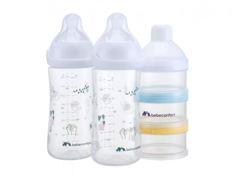 Zestaw zawiera dwie butelki dla niemowląt Bebeconfort Emotion Physio oraz dozownik na mleko modyfikowane.