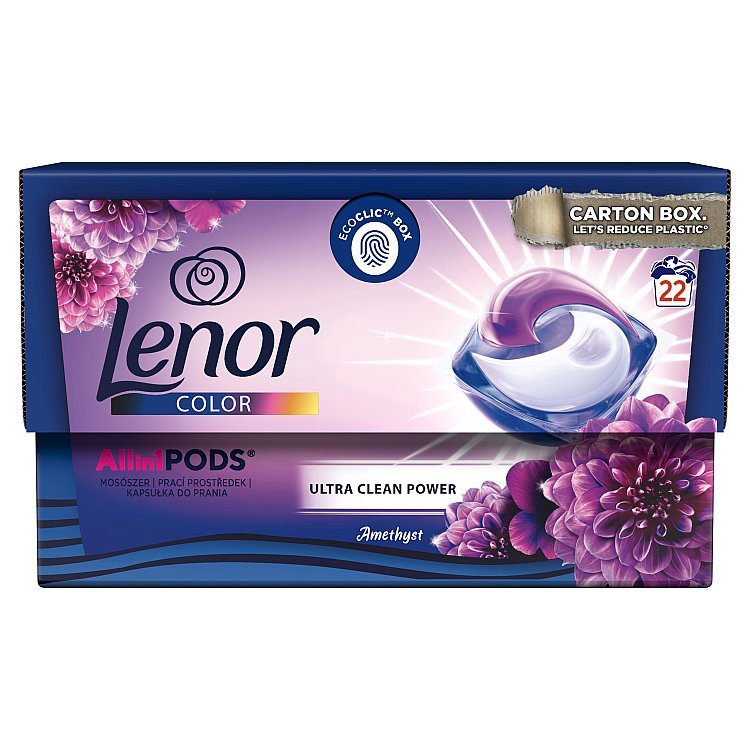 Kapsle pro praní barevného prádlaKartonové balení 22 ks Vyčistí oblečení do hloubkyTechnologie ochrany vláken a barevVůně bergamotu, frézie a jasmínu Gelové kapsle Lenor Amethyst And Floral Bouquet s tajemným koktejlem oslnivého bergamotu a se svěží kyticí jemné frézie a nádherného...