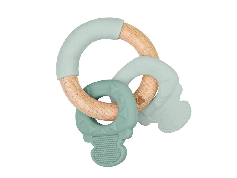 Kousátko KikkaBoo v podobě kroužku s klíči je vyrobené z bezpečného, jemného silikonu a bukového dřeva. Různorodé textury kousátka lákají dítě ke zkoumání v ústech a pomáhají při prořezávání jeho prvních zoubků. Tvar kousátka umožňuje jeho snadné uchopení malými dětskými ručičkami.