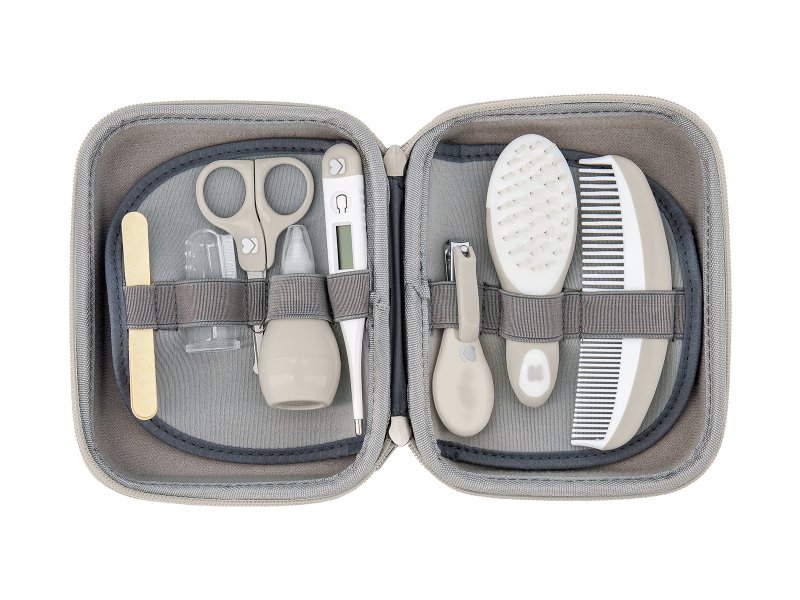 Zestaw artykułów higienicznych do pielęgnacji Twojego dziecka od urodzenia zawiera termometr cyfrowy, aspirator do nosa, grzebień, szczotkę do włosów, szczoteczkę masującą do zębów i dziąseł, cążki do paznokci, nożyczki i pilniczki do paznokci. Wszystkie akcesoria są umieszczone w elastycznych uchwytach w praktycznym etui, które jest wygodne do przenoszenia i idealne również w podróży. Wymiary etui: 17,5 x 14 x 5,5 cm Odpowiednie dla dzieci od urodzenia.