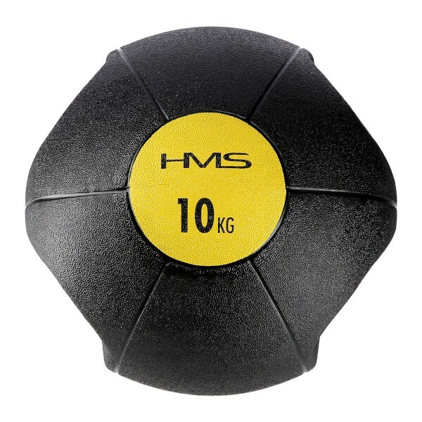 Medicinbal HMS NKU10 je vyroben z hrubé a pevné gumy vyplněné pískem. Díky úchytům jde o kombinaci medicinbalu a činky.
