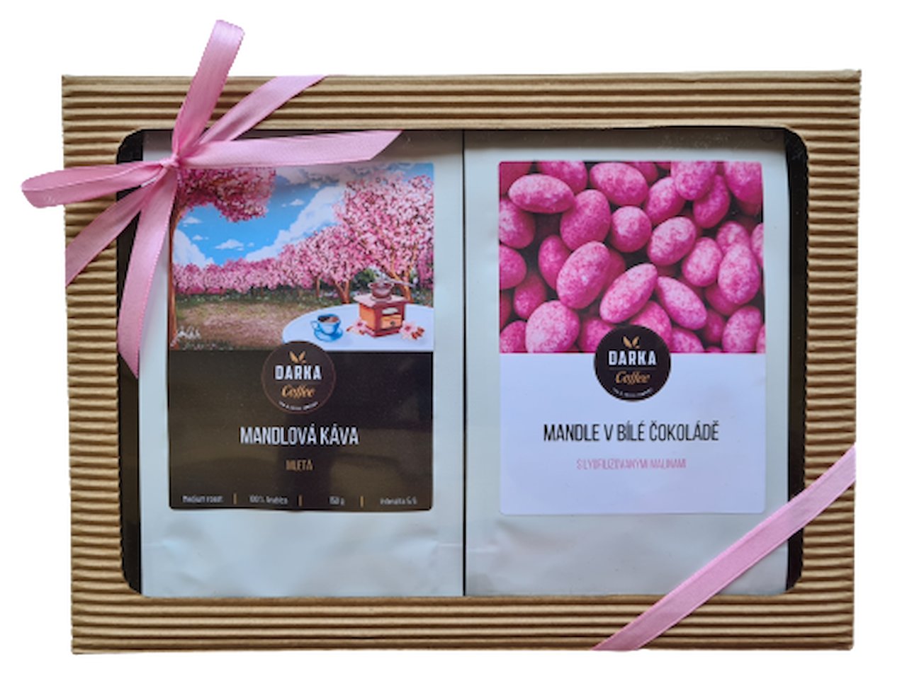 Dárková kazeta Mandlové pokušení: Originální dárková kazeta určená zejména ženám v sobě skrývá naprosto delikátní mandle v bílé čokoládě s lyofilizovanými malinami a exkluzivní čerstvě praženou kávu arabica Brazílie Santos. Tímto dárkem ohromíte chuťové smysly, neboť výborná káva s luxusními...