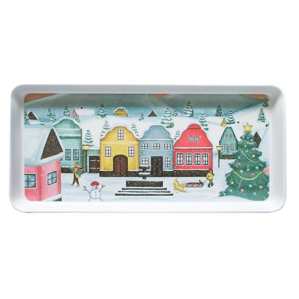 Taca z motywem "Wioska" o wymiarach 35 x 16,5 x 2,3 cm wyróżnia się delikatnym wzornictwem w świątecznym stylu. Jej rozmiary są odpowiednie do wygodnego podania ciastek, świątecznego wypieku czy drobnych upominków. Dzięki niskim rantowi obsługa tacy jest bardzo prosta. Praktyczny rozmiar pozwala na wykorzystanie jej nie tylko w okresie świąt, lecz także przy innych uroczystych okazjach czy spotkaniach towarzyskich.