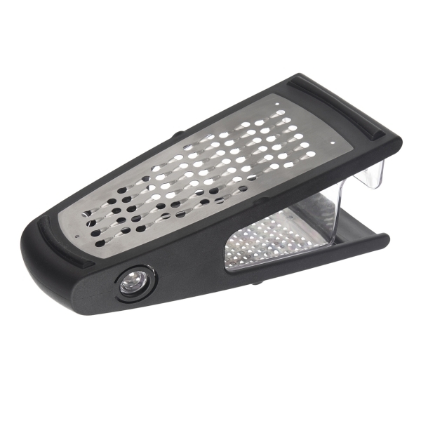 Tarka dwustronna z pojemnikiem i dwiema powierzchniami - drobną i grubą. Produkty spożywcze ściera zarówno przy ruchu w górę, jak i w dół. Dzięki pojemnikowi starte produkty nie wypadają na zewnątrz. Zapewnia bardzo wygodne użytkowanie. Dzięki silikonowym wypustkom nie ślizga się po podłożu. Materiał: stal nierdzewna, plastik MABS, nylon, silikon. Wymiary: 23,5 × 11 × 10 cm. Można myć w zmywarce. Po umyciu w zmywarce dobrze wysusz. Częste używanie zmywarki powoduje stopniowe tępenie ostrzy.