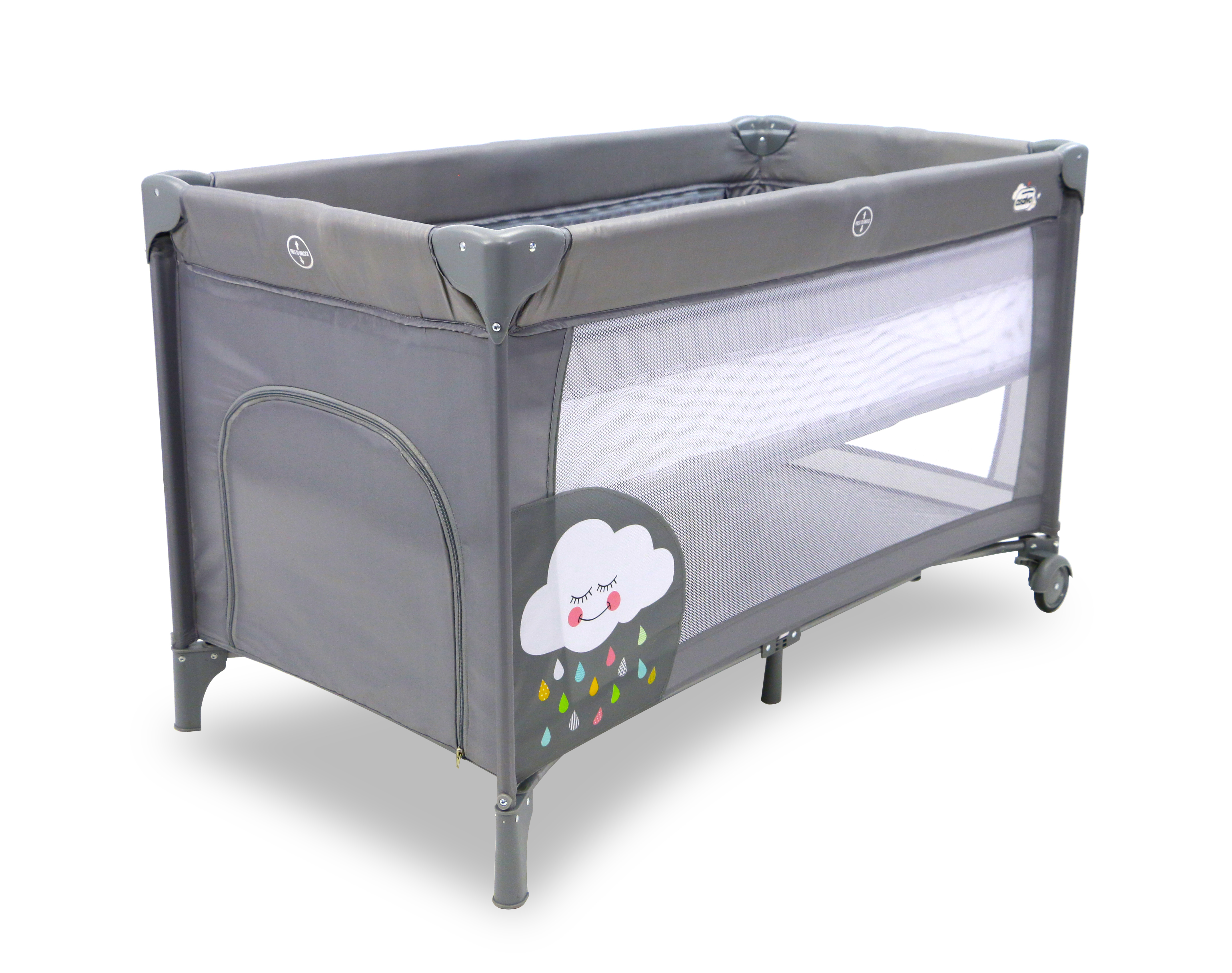 Cestovní postýlkaKrásná cestovní postýlka s potiskem a závěsným dnem. VLASTNOSTI:Vhodná pro děti od narození do 15 kg.2 kolečka s brzdou pro snadnější manipulaci.Pevná konstrukce.Dvojitá bezpečnostní pojistka.Plastové rohy krásně ladí s barvou postýlky.Polstrovaná základna a přepravní taška...