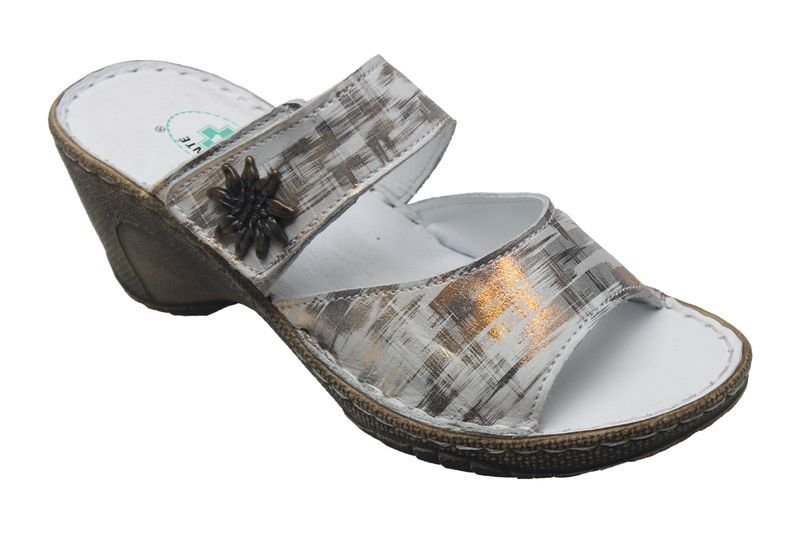 Zdravotní obuv - dámské pantofle,barva: stříbrná, bílá,podešev: hnědá,stélka: anatomicky tvarovaná, kožená,materiál: kůže,klínek: cca 6,5 cm,zapínání na přezku.Náš tip:V naší nabídce naleznete také další dámskou zdravotní obuv. przeczytaj całość