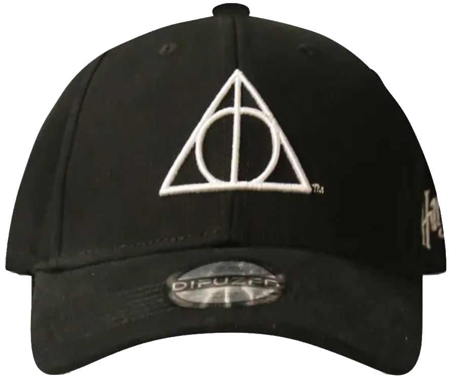 Černá basseballová kšiltovka inspirovaná znakem Relikvie smrti ze série Harry Potter.